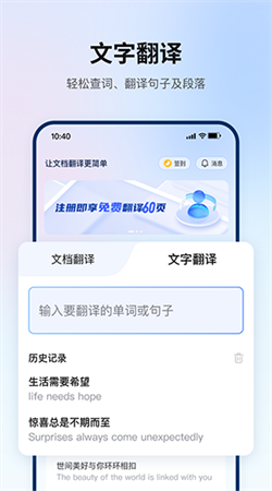 2、APP提供多种翻译方式,如文本翻译、文档翻译、拍照翻译等。