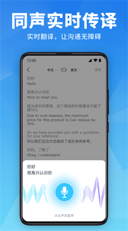 1.语音翻译:支持语音输入和翻译,方便用户在通话或会议中使用。