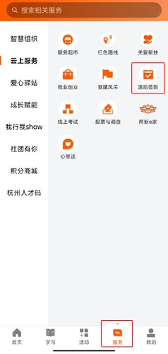 服务界面包含智慧组织、云上服务、爱心驿站、成长赋能以及杭州人才码等功能板块。