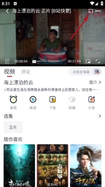 首先我们打开想要观看的视频,在右上角能看到这样的图标,这就是投屏功能。