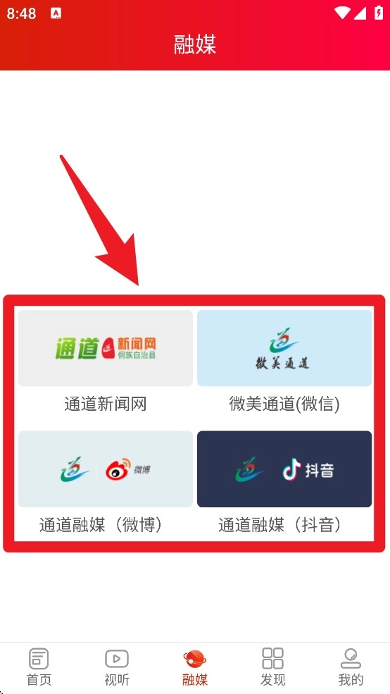 点击“融媒”标签,就能快速跳转到通道微型部落格、抖音和新闻网站,获取更多元的资讯。