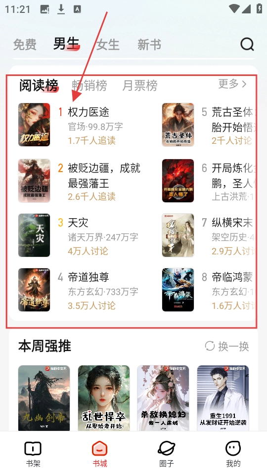 进入书城后,在阅读榜单中可以看到不少小说,像《权力医途》就位列其中,要是对哪本感兴趣,直接点击就能进入它的详情页面。