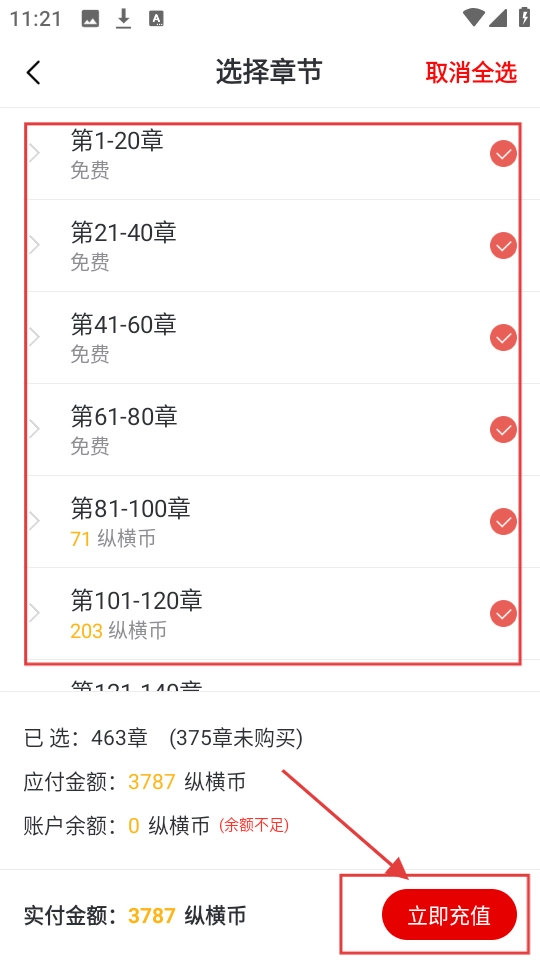 进入章节选择页面,选定章节后,若账户余额不足,可点击【立即充值】按钮。