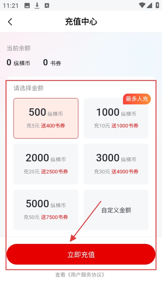 前往充值中心,选定充值金额(例如【500-纵横币】),接着点击【立即充值】按钮,即可完成充值操作。