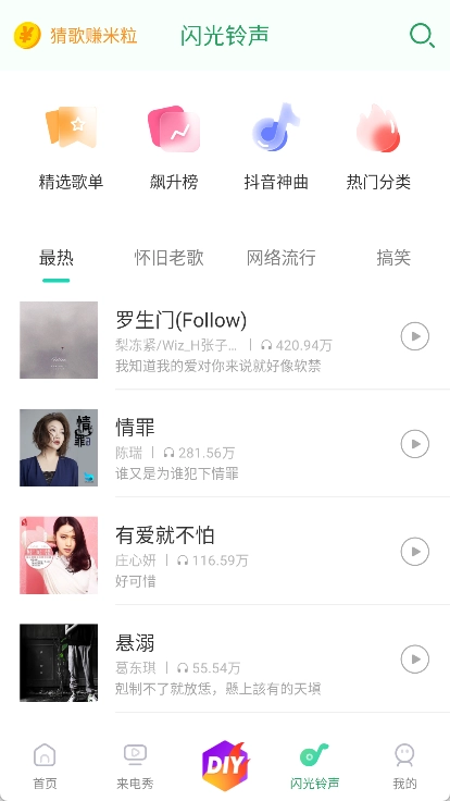 热门榜单:网罗全网热歌、影视金曲与欧美日韩音乐,还有新歌尝鲜榜,让来电时刻更添嗨感。