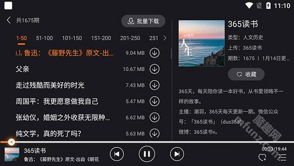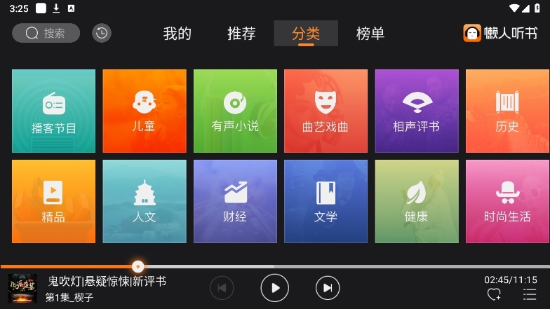 提供儿童、有声小说、相声评书、人文、财经、文学、健康、精品、历史等多个分类。