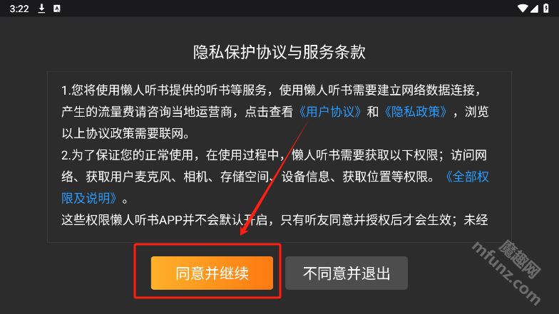首先前往魔趣网下载并安装懒人听书车机版的最新版本,然后点击“同意并继续”按钮进入软件。