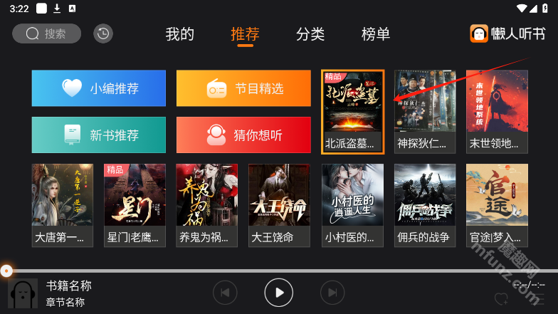 首先前往魔趣网下载并安装懒人听书车机版,进入软件后就能看到不少推荐的内容。