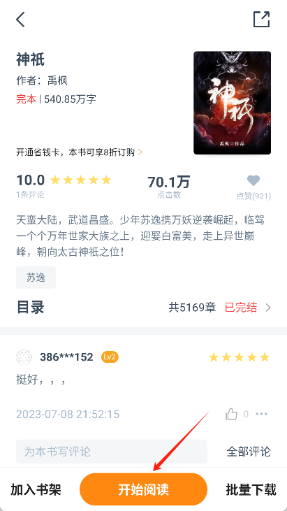 找到小说后,点击它的封面就能进入阅读详情页,接着点击“开始阅读”按钮,就可以进入阅读页面了。
