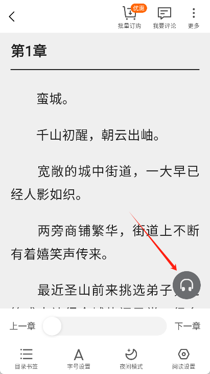 在阅读页面里,点击屏幕中间位置就能调出阅读设置,接着点击右下角的“听书”按钮,这样就可以开始听书了。