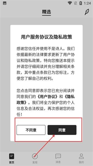 进入【不是诗人】应用后,系统会弹出《用户服务协议及隐私政策》的提示窗口。请您仔细阅读相关条款内容,确认无误后点击【同意】按钮,即可解锁并使用应用的全部功能。