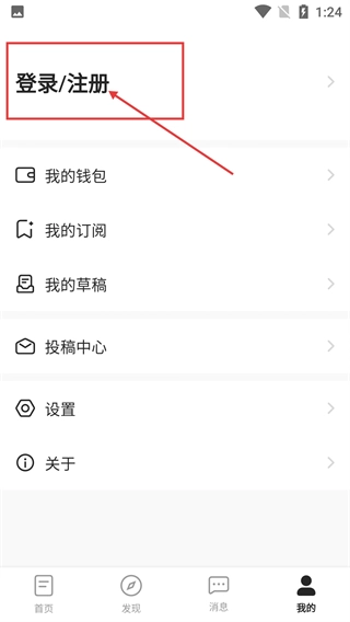 进入【我的】页面后,顶部会显示【登录/注册】选项,点击此选项就能进入相应的账号操作界面,从而使用更多功能。