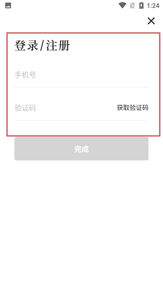 在【登录/注册】页面,首先输入【手机号】,接着点击【获取验证码】,输入收到的验证码后,就能点击【完成】按钮完成操作。