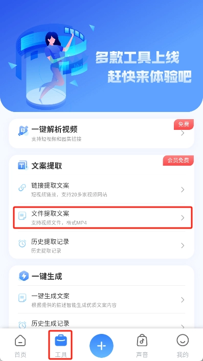 然后打开应用程序,在工具界面里点击“文件提取文案”这一选项。