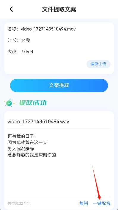 在文件夹里挑选音频文件,等提取工作完成后,点击“一键配音”按钮。