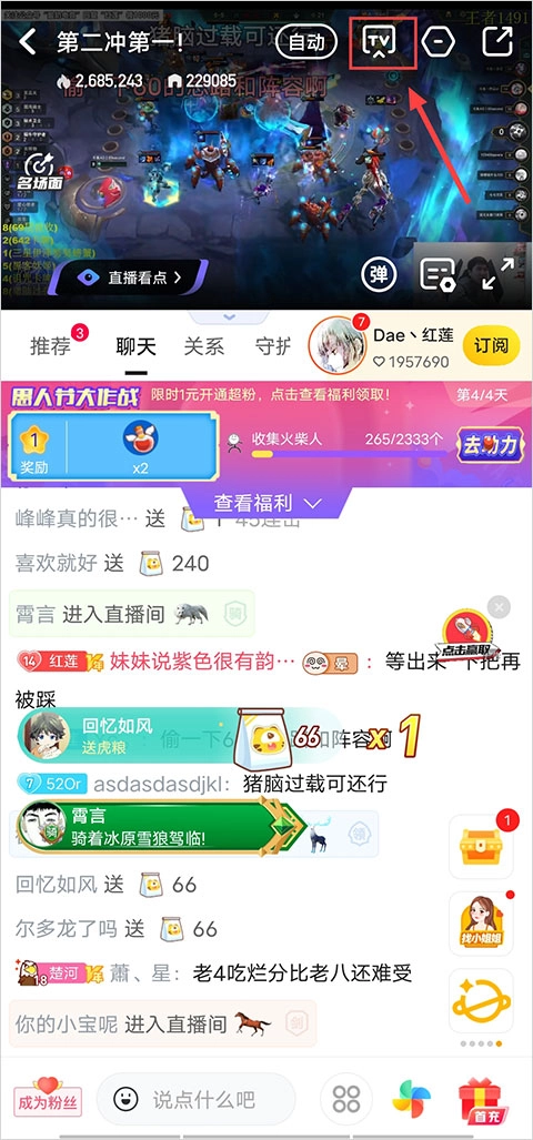 在直播画面的右上角会出现一个“TV”图标,你可以点击这个图标。