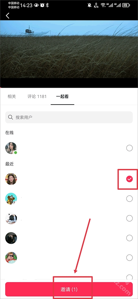 在放映厅里打开一部你喜爱的电影或剧集,接着在视频播放页面找到“一起看”功能选项,邀请你想一同观看的朋友,再点击发送邀请即可。
