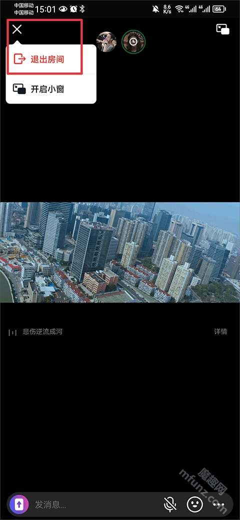 观影结束后,点击左上角的“X”按钮,接着选择“退出房间”,就能结束这次共同观影的体验了。