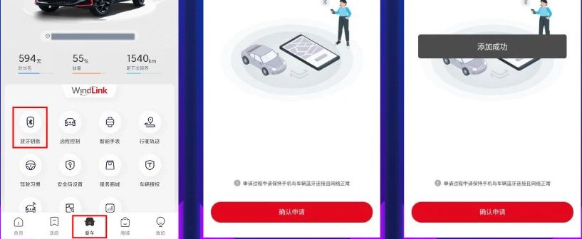 第4步登录“东风风神”,依次点击“爱车”“蓝牙钥匙”“确认申请”,添加成功后智能手机蓝牙钥匙功能即激活。