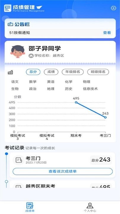 这是一款专为学校场景打造的成绩管理软件,支持多样化的成绩录入方式,能够对成绩信息进行精细化管理,还具备系统排名查询、标签分类、学习笔记记录等实用功能。此外,软件可直观呈现成绩趋势图、排名变化趋势图、各学科分析雷达图以及成绩对比图表。