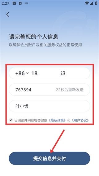 4、进入个人信息填写页面后,补充手机号、验证码、姓名等所需信息,点击【提交信息并支付】按钮,即可完成入会申请流程。