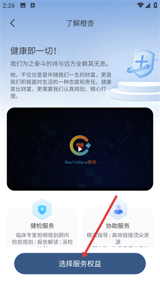 2、进入“了解橙杏”页面后,点击【选择服务权益】按钮,即可跳转至服务权益说明页面。