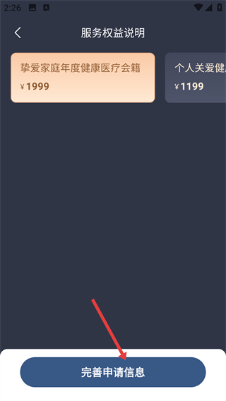 3、在服务权益说明页面选定目标会籍后,点击【完善申请信息】按钮,即可进入个人信息填写页面。