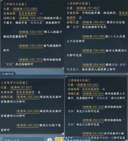 可获取龟寿屿(97,387)、刺桐港(835,892)的4个大宝箱