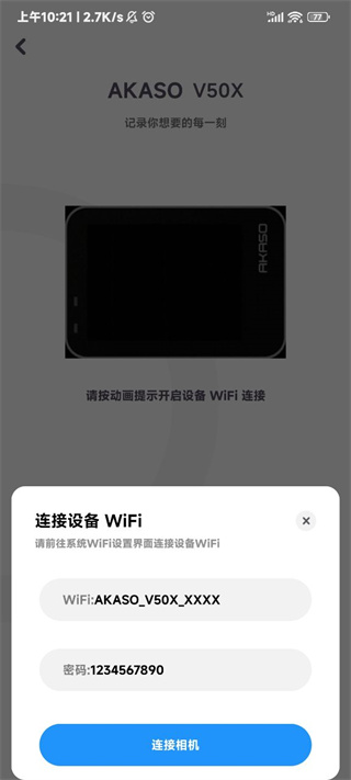 这时你只需进入系统WiFi设置页面连接设备WiFi,点击连接相机稍作等待即可成功连接。