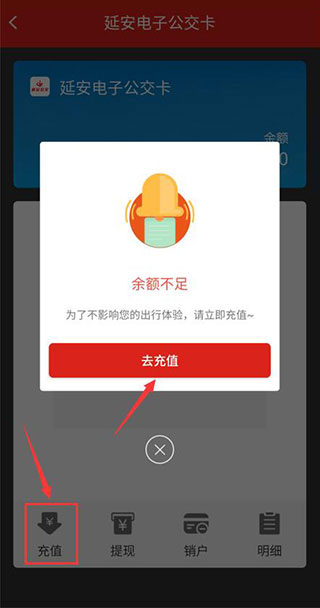 当我们打开电子公交卡的二维码时,要是余额不够,系统就会弹出提示消息。这时候,我们既可以点击提示下方的【去充值】按钮,也能通过左下角的【充值】入口进行操作。