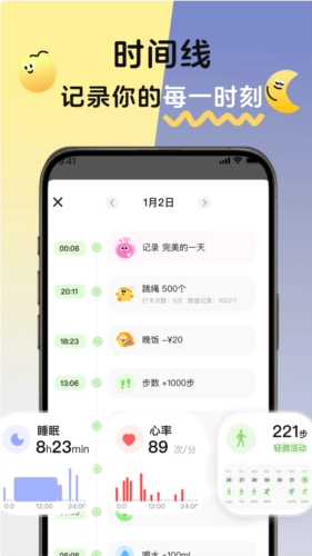 可以自动记录每天的步数、热量消耗、饮水数据,还有纪念日,健康美好的生活点滴都值得被记录下来。