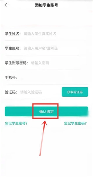 输入学生账号信息,完成手机号短信验证后,点击【确认绑定】按钮即可。