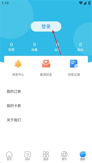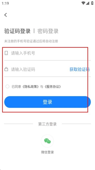 在个人中心页面,点击登录按钮,即可进入验证码登录页面。