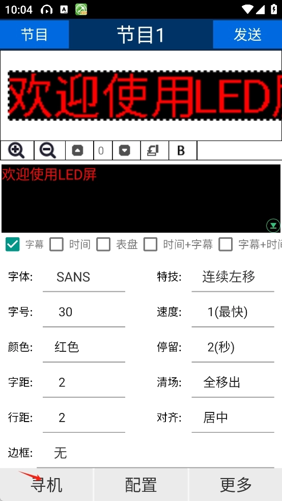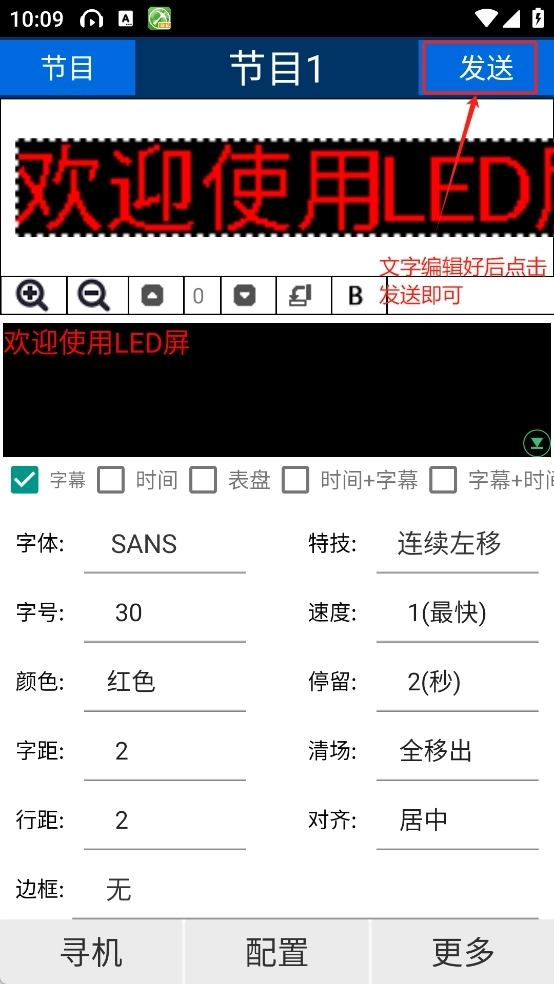 显示屏参数加载完成后,返回主界面进行文字编辑,设置文字大小、速度等选项,点击“发送”按钮就能成功显示内容。