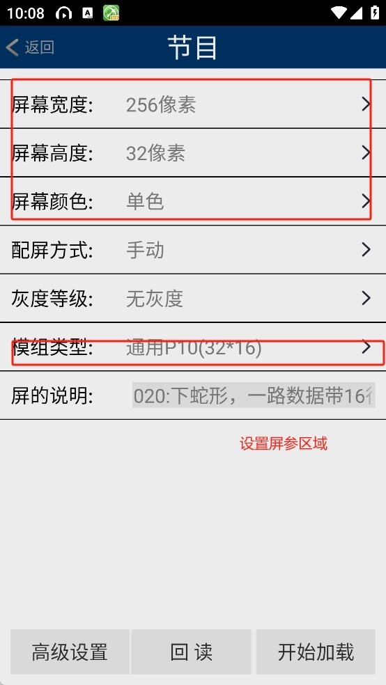 点击配置按钮进入配置界面后,请依据显示屏的实际参数完成各项设置,并选择对应的模组。设置完毕后点击“开始加载”,加载成功将自动进入显示屏主界面;若需调整数据极性、OE极性或扫描点频,可进入高级设置进行选择。后续使用时仅需执行“回读”操作,无需重复加载。
