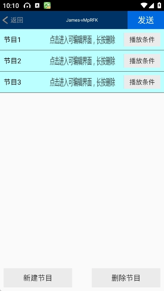 若您需要添加多个节目,可点击左上角的“节目”按钮进入节目界面。接着点击“新建节目”,随后选中您刚创建的节目条,进入主界面进行内容编辑,操作方式与第三步相同。编辑完成后,直接点击发送按钮即可。