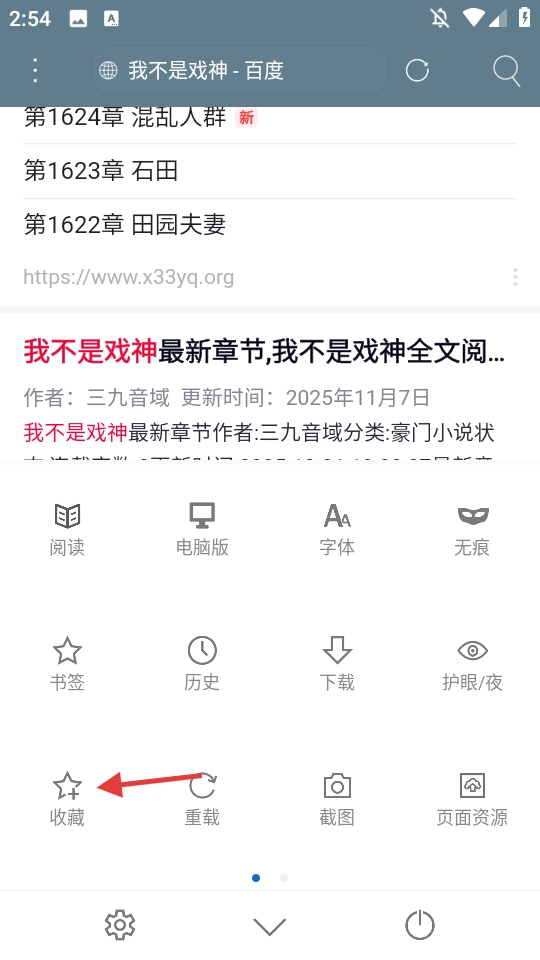 在需要收藏的页面上,点击底部的菜单按钮,这样就能展开功能选项的列表了。