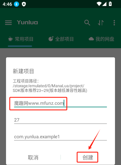 接下来为项目拟定一个名称,以便后续进行编辑操作。名称填写完毕后,点击“创建”按钮即可。