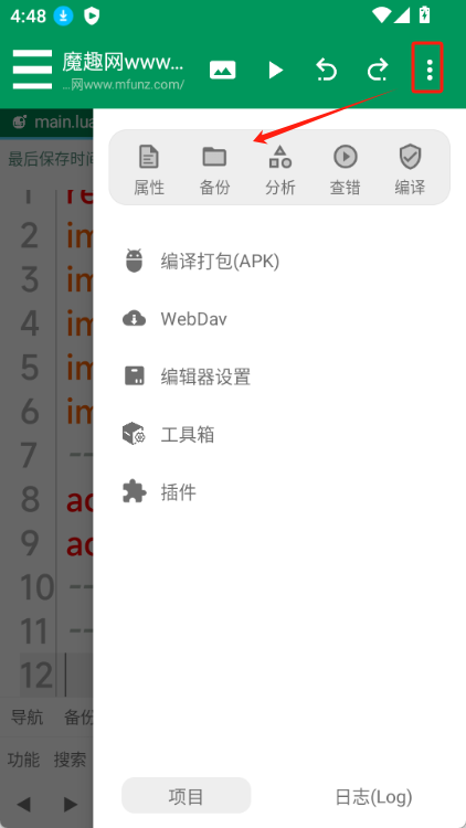 点击右上角的【...】按钮,即可看到编辑器设置、工具箱、插件以及编译打包等功能选项。