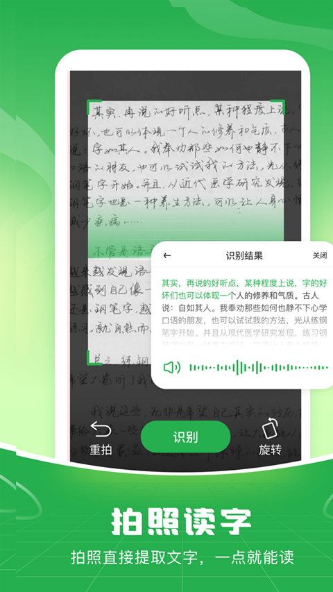 4. 拍照朗读与文字提取:使用手机拍照就能提取图片里的文字,还支持语音播报和直接复制的功能。